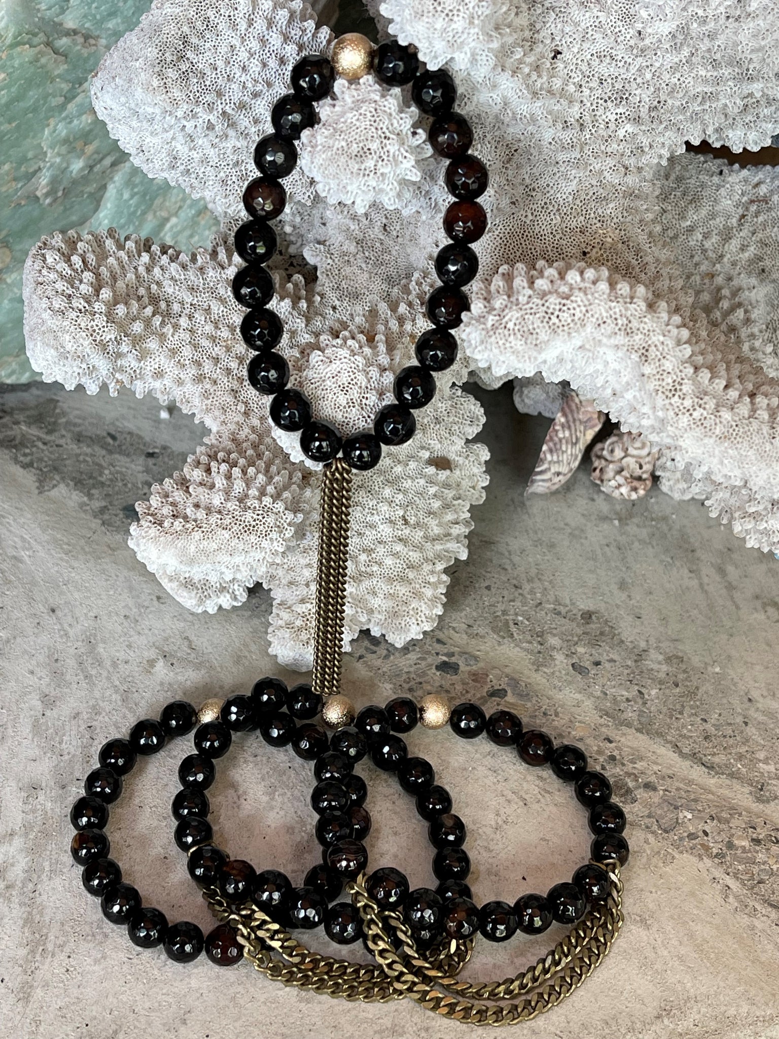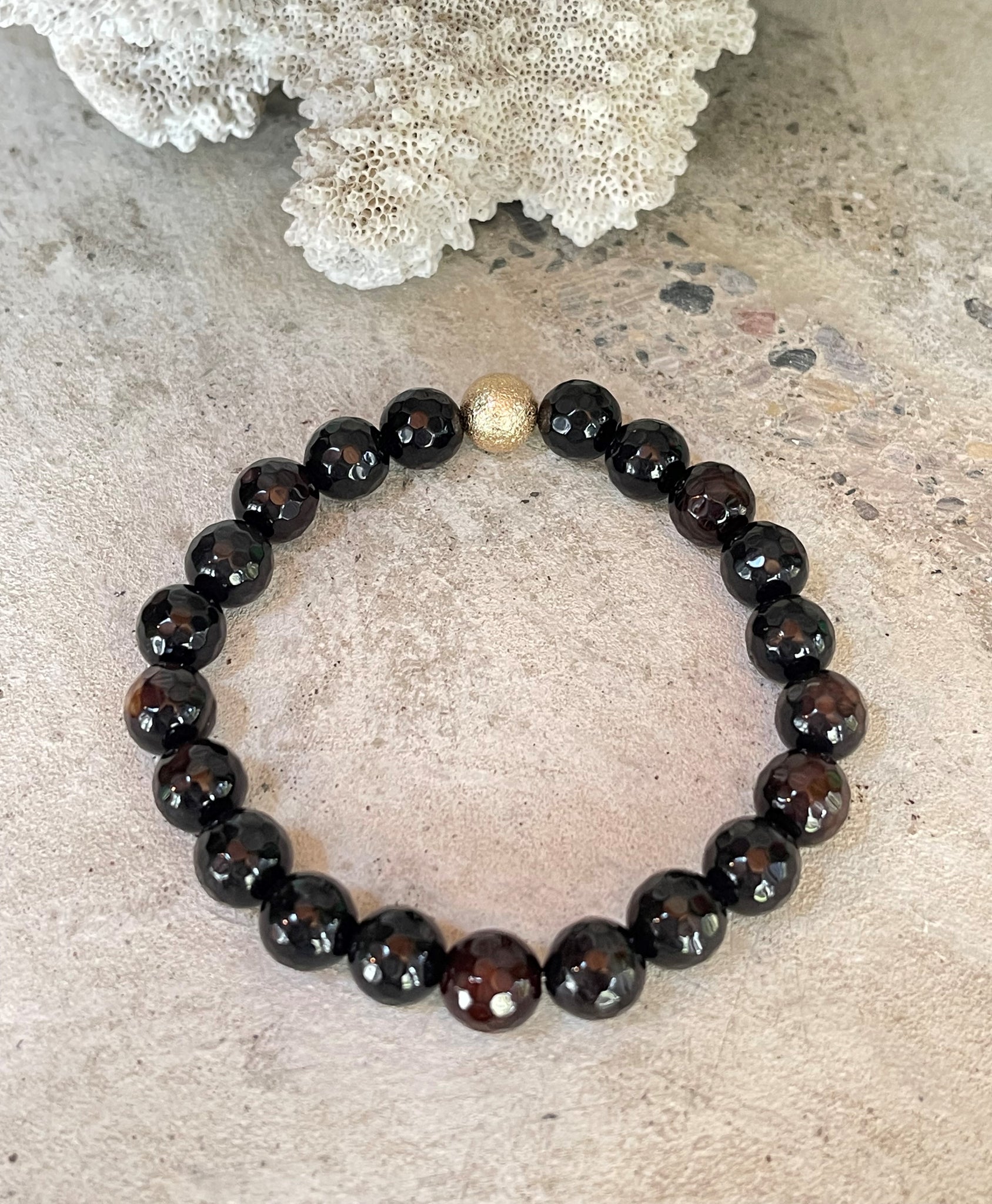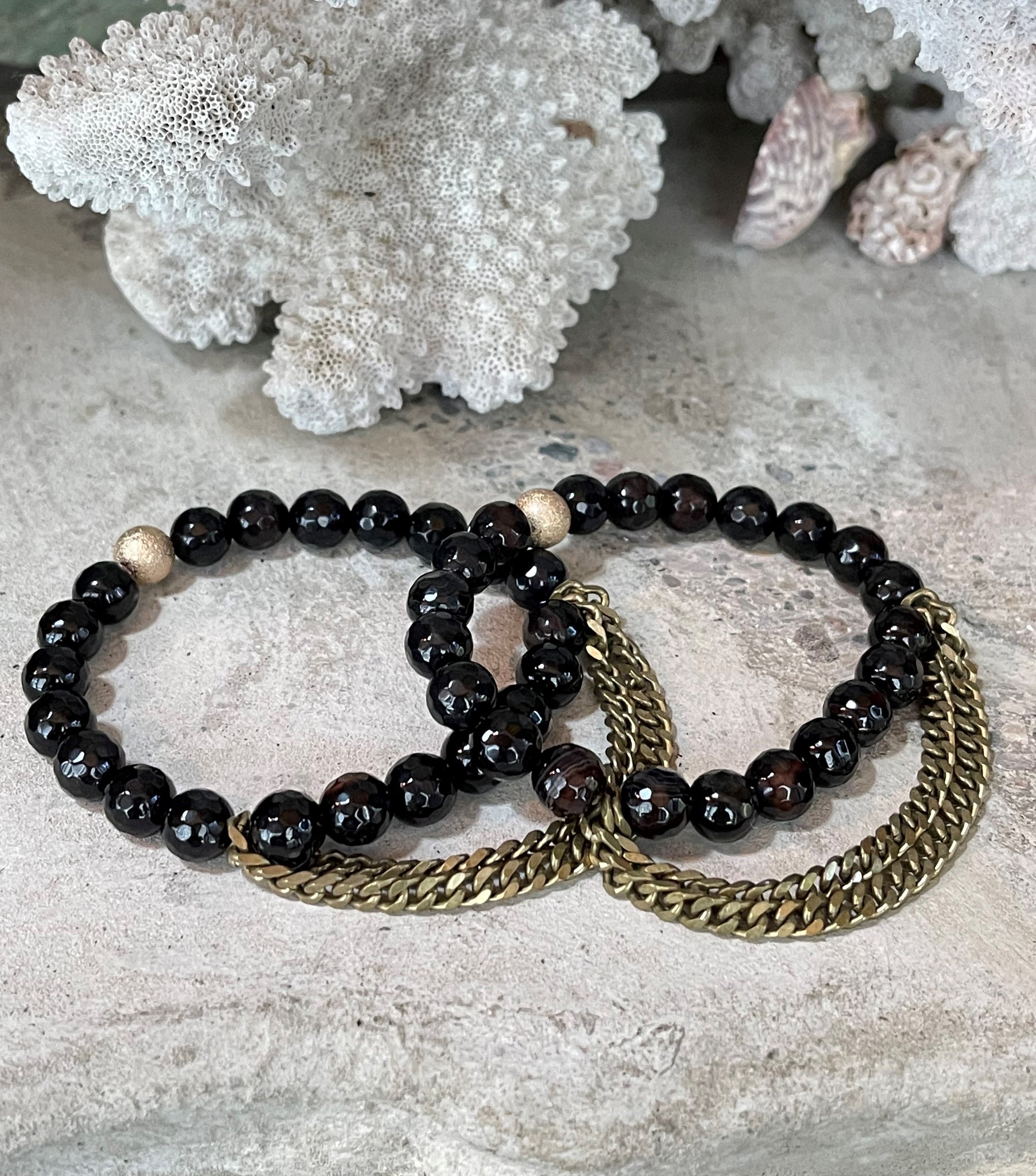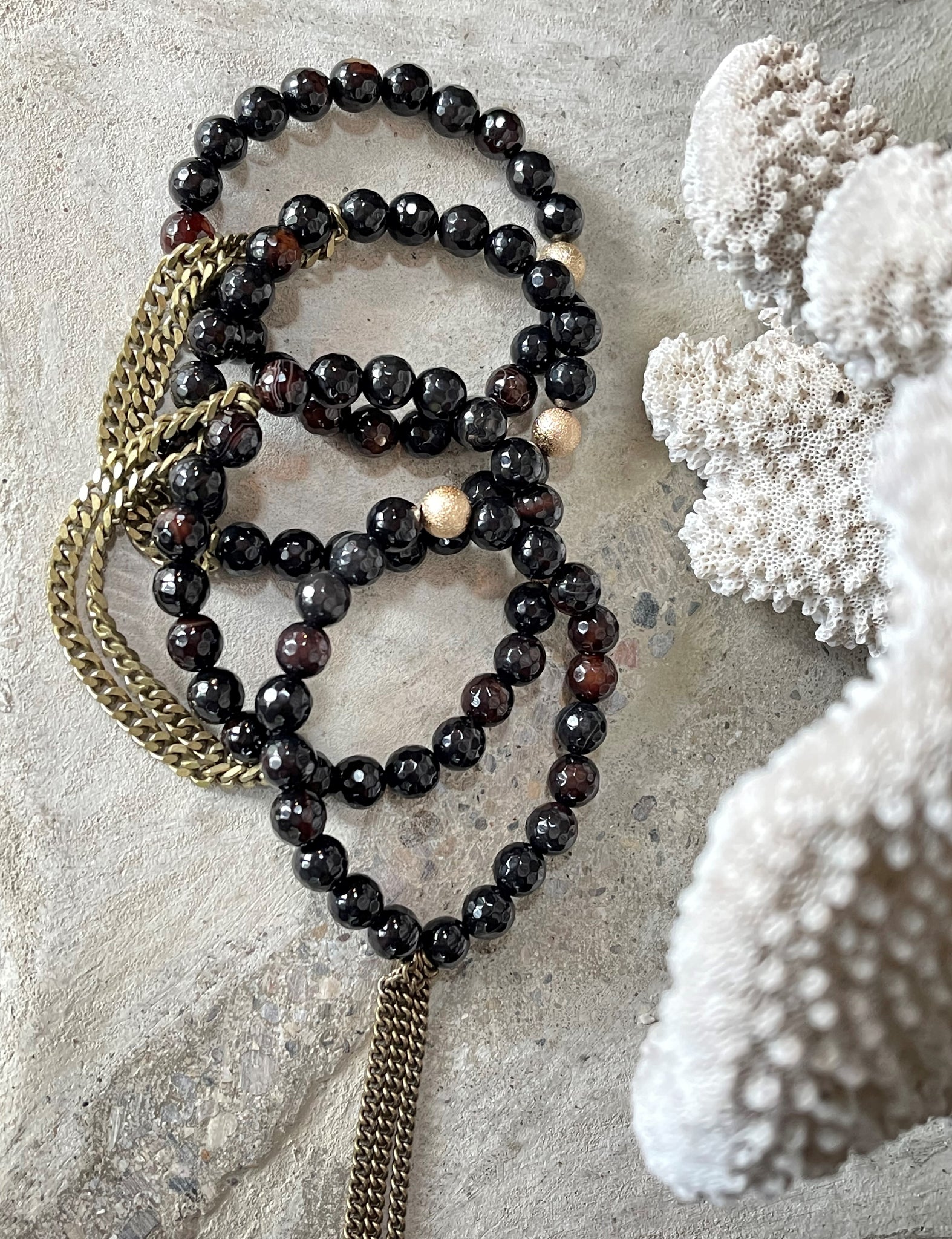 These singles comes as pictured, made with Dark Brown Faceted Gemstones, dangle chains, double loop chains, no chains and 14k gold filled spacer beads. Please choose from the drop down menu. Sold as a single bracelet.