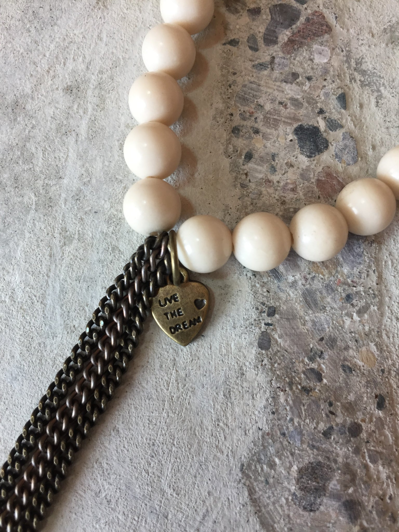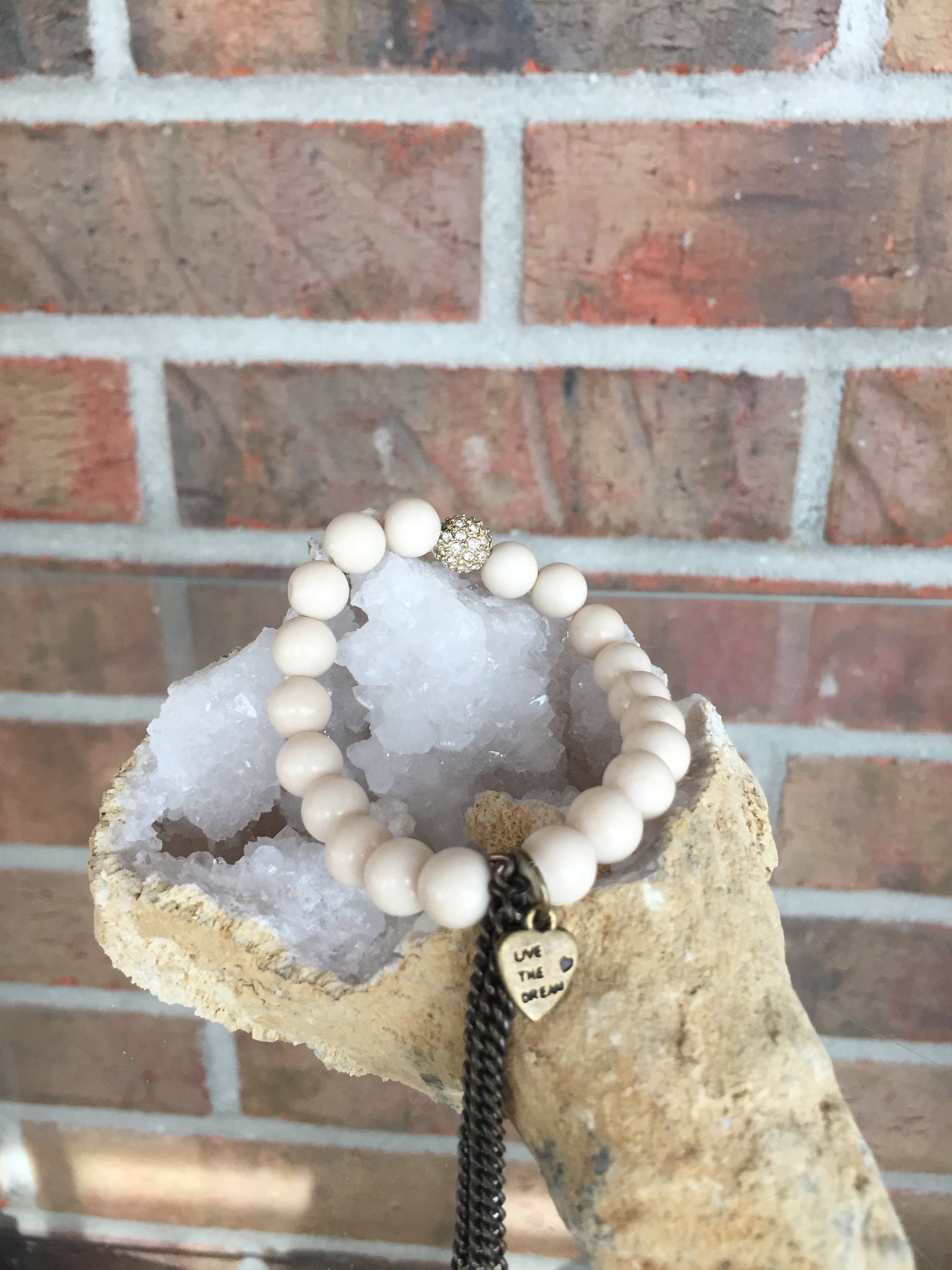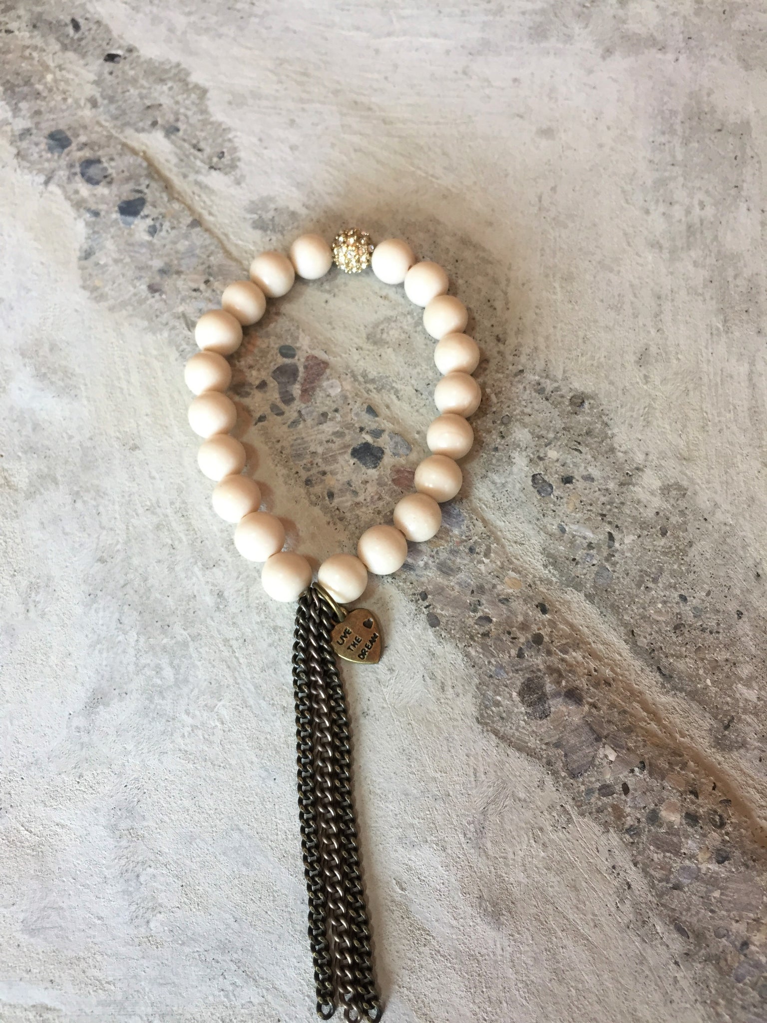 This single made with Nude gemstones and gold filled pave bead with dangle chain and small antique heart charm Live The Dream :)